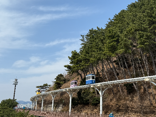 왼쪽엔 열차랑 스카이 갭슐이 지나가고 오른쪽엔 바다가 펼쳐져 있다.